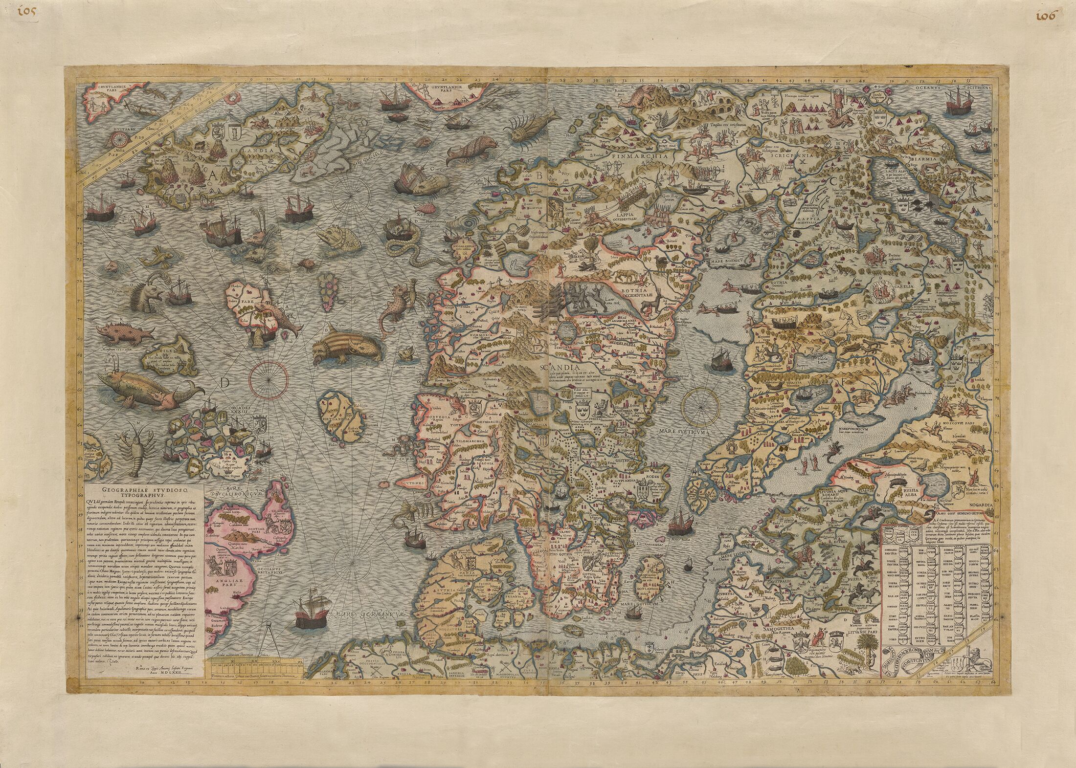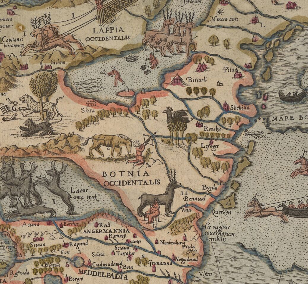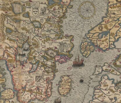 Poster with map Carta Marina printed on it. Carta Marina is the earliest reasonably accurate map of the Nordic and Baltic countries. The author of the map, Olaus Magnus (1490–1557) put twelve years of work on the map before it was printed in Venice in 1539. In 1572 Antonio Lafreri published a reduced copy of the Carta marina in Rome and it is that colorful version on the poster.