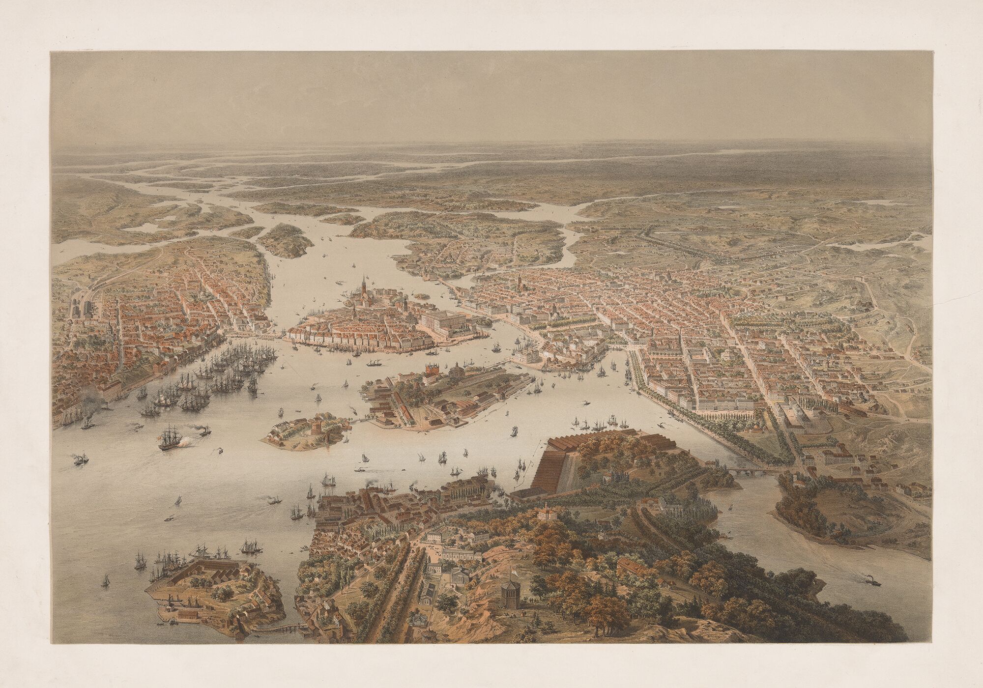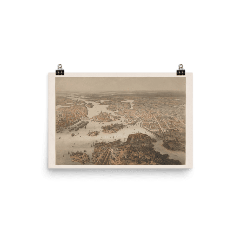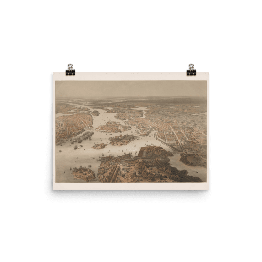 Poster with lithographer  Carl Johan Billmark’s very realistic ballon panorama in central perspective from 1868 showing Swedish city Stockholm to the west from a point high above Södra Djurgården.